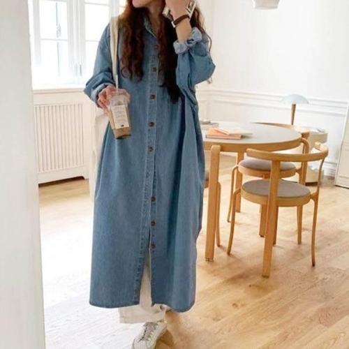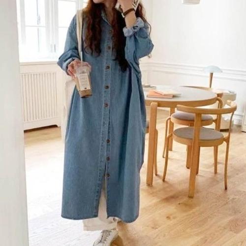 SAHINER 봄가을 여성 데님 셔츠 롱원피스 A라인 캐주얼 오버핏 LWBQZ35