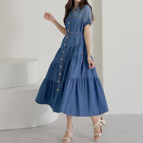 [옷자락]여자 봄맞이 빅사이즈 버튼 카라 캉캉 데님 롱원피스