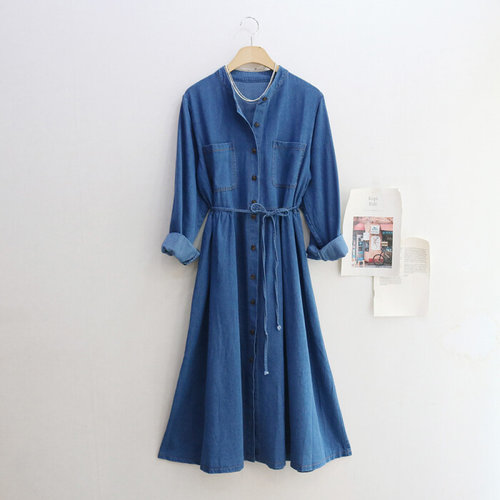 레이츄 / 무배 레이디 헨리넥 가을 데님 청 롱원피스
