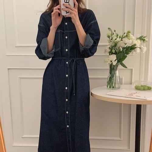 [샵앤][샵앤] 리플 여성 카라넥 단추 오픈 벨티드 데님 긴팔 롱원피스 JL-WDR-1584-진청