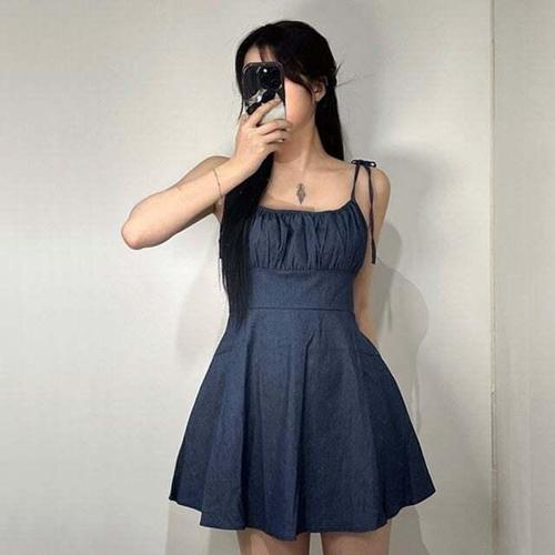 [셀럽하우스]여성 UFQY1203 캐주얼 플레어라인 끈나시 데님 미니 원피스