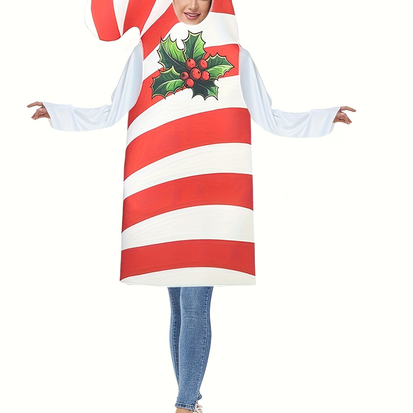TEMU 여성용 사탕 막대 크리스마스 코스튬 (빨강 & & 홀리 잎 디자인) - 키홀 넥라인, 긴소매 풀 바디 의상 (후드 헤드피스 포함), 기계 세탁 가능 ( 파티, 코스프레, 테마 이벤트용) - 축제 분위기 크리스마스 파티 의상