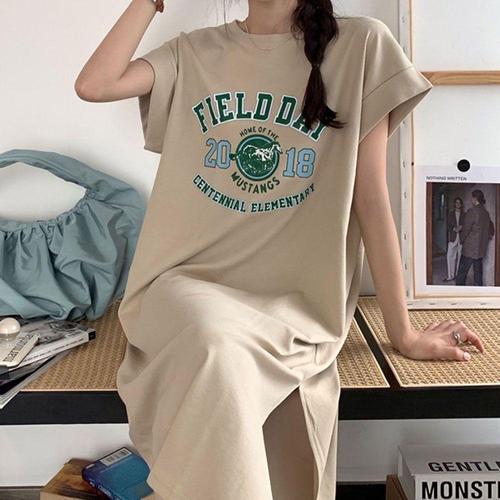 [셀럽하우스]영문 AGOY7415 프린팅 롤업 옆트임 롱 원피스 데일리룩