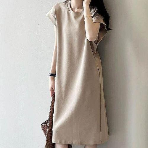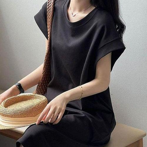 루즈핏 라운드넥 베이직 허리 포인트 캐주얼 반팔 롱 원피스