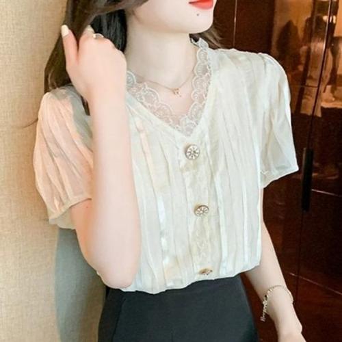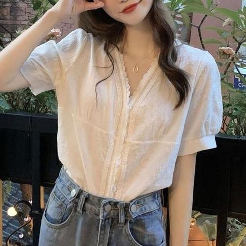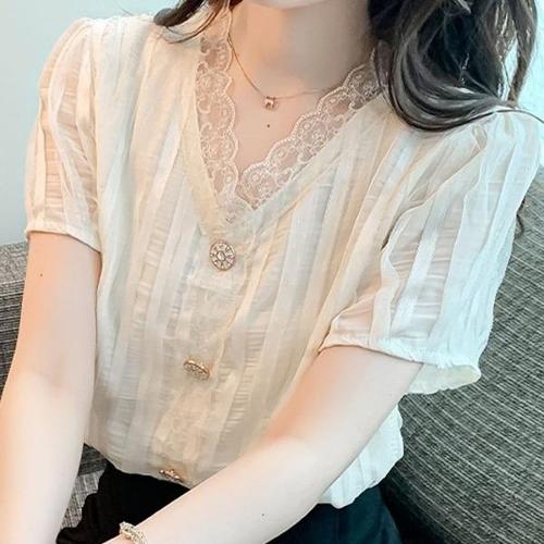 [엄지척]봄 여름 가을 브이넥 레이스 데일리 반팔 블라우스_19643915_667501