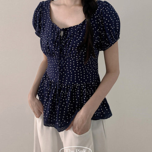 더핑크 / 사엘 도트 스트랩 퍼프 스모크 밴딩 블라우스