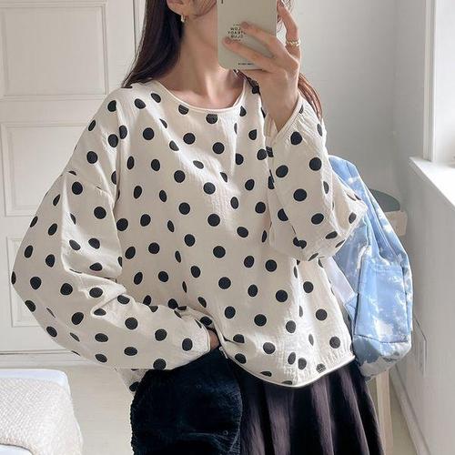 [옷자락] 여성 노카라 라운드넥 배색 땡땡이 긴팔 블라우스