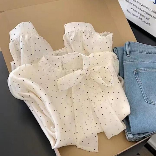 지고다그 1+1 여성 봄가을 쉬폰 블라우스 도트 패턴 리본 타이 긴팔 우아한 셔츠 SX68459