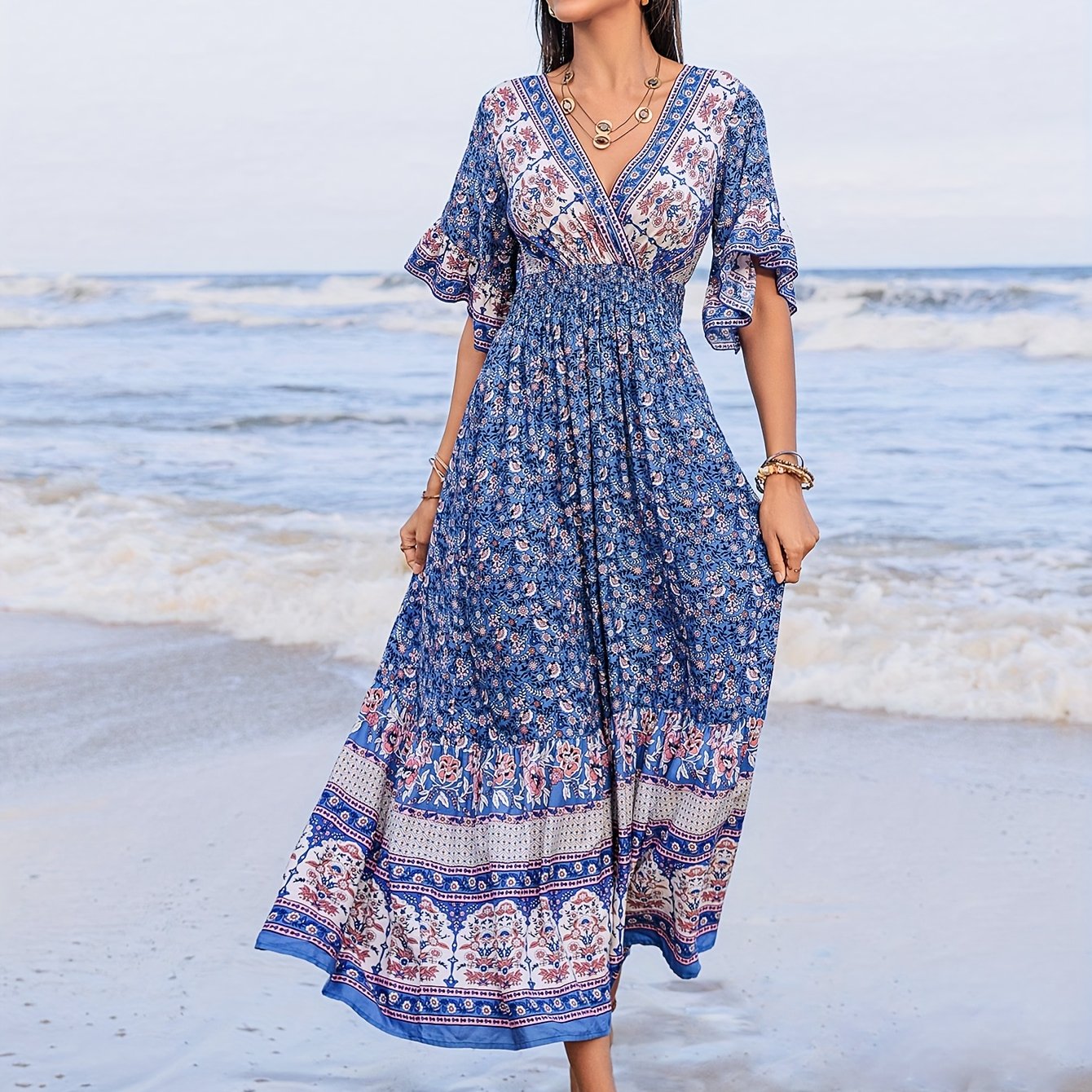 TEMU Rusttydusttyaa 프렌치 스타일 블루 앤 화이트 플로럴 롱 드레스, 퍼프 소매 및 V넥, 핏팅 허리, 캐주얼 외출, 피크닉 및 휴가에 적합