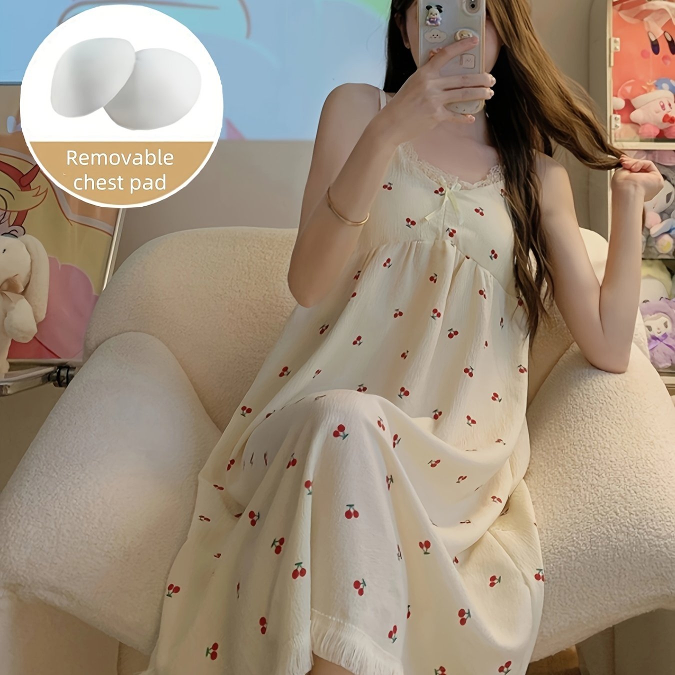TEMU 달콤한 기분 좋은 프린트 나이트가운 - 매력적인 리본 디테일, 로맨틱 레이스 트림, 루즈핏, 편안한 슬립 드레스