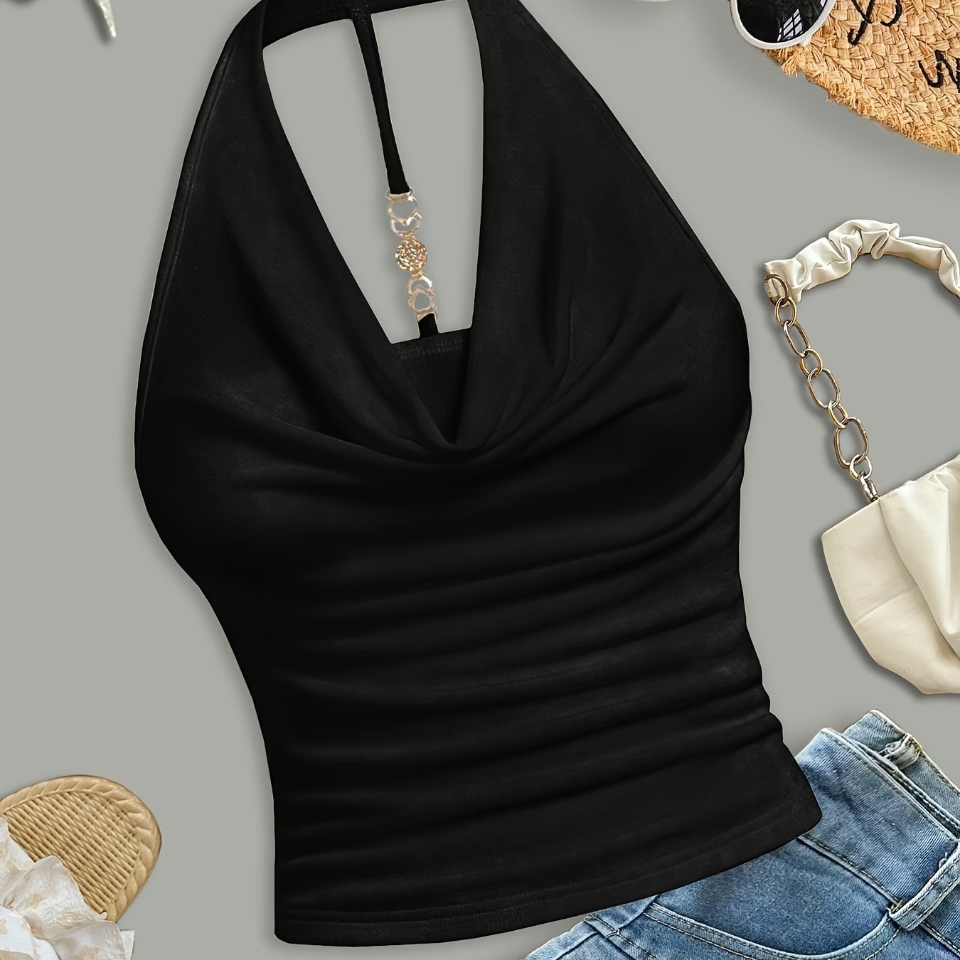 TEMU 여성용 우아하고 패셔너블한 숄더넥 숄더끈 캐미솔, 드레이프드 칼라, 슬림핏, 몸매 비침 있는, 섹시한 단색 민소매 탑
