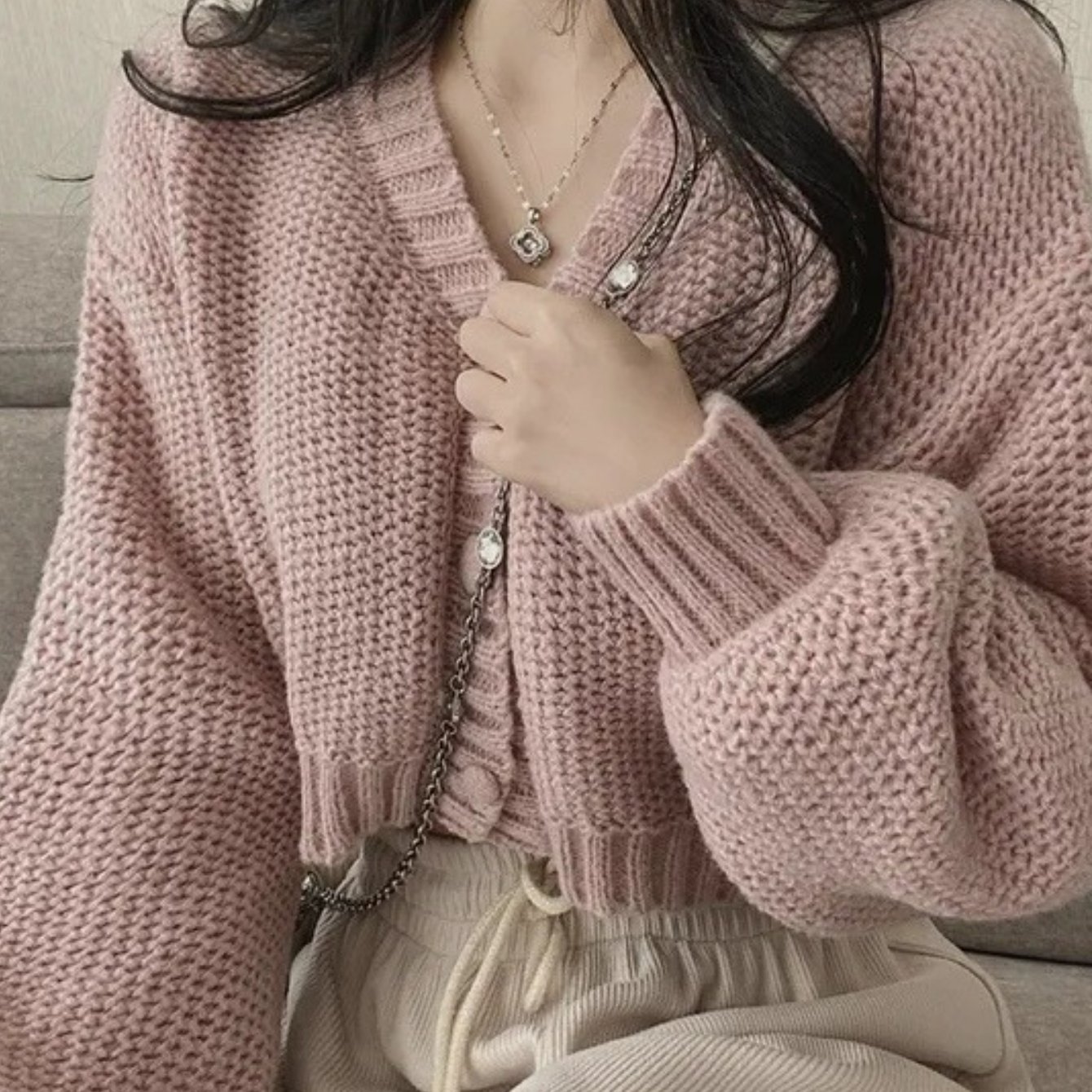 제인 소매 단추 브이넥 니트