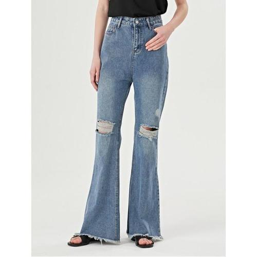 [신상오픈런]여성용 컷팅 디스트로이드 부츠컷 맥시 와이드 워싱 진