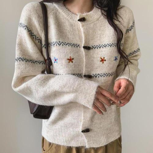 [옷자락]여성 울혼합 떡볶이단추 자수 여유핏 노카라 카디건