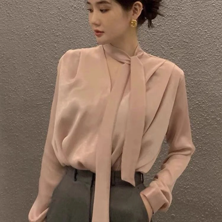 2025 봄/여름 트렌디 여성 블라우스 - 긴팔 V넥 단색 셔츠 - 세련된 오피스룩