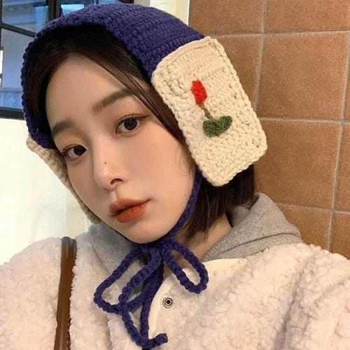 플라워 자수 니트 귀마개 귀 보온 보호 손뜨게 패션템 WECC586