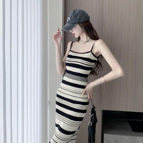 [모노무드]LMO 타이트핏 플레어라인 크롭 스트라이프짜임 뜨개탑 드레스모던