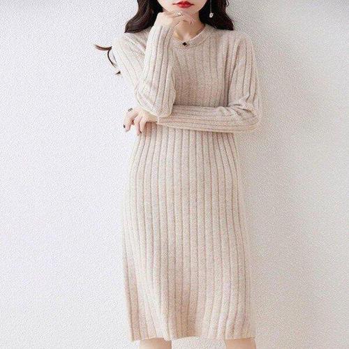 여성 원 니트 V넥 긴 소매 하이 웨이스트 슬림 A 라인 롱 뜨게 드레스 맥시 티도 가을 및 겨울 신상