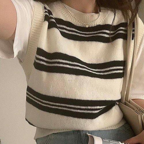 [모노무드]LMO 여성용 브이컷 듀얼컬러 줄무늬 뜨개탑슬리브리스 클래식