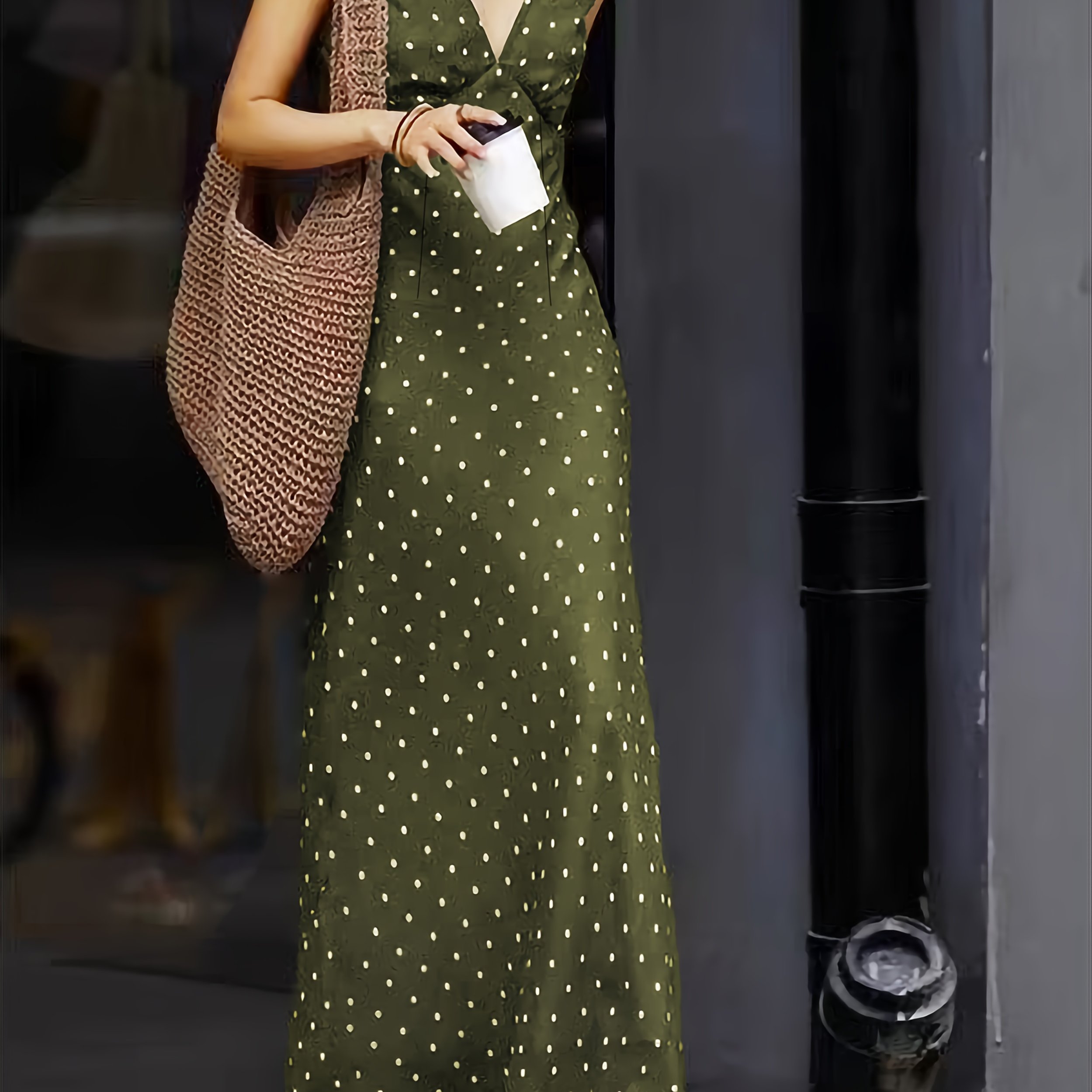 TEMU 여성 프렌치 빈티지 우아한 V넥 민소매 맥시 드레스 (폴카 도트 & 단색 옵션) - 구조적인 A라인 실루엣, 허리 묶음 백, 세탁기 사용 가능 (봄/가을 캐주얼 & 포멀 행사, 포멀 복장, 세련된 스타일)|나시원피스|민소매원피스