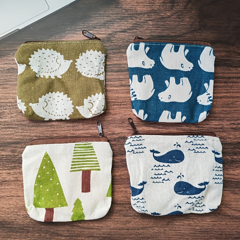 TEMU 4개 여성용 귀여운 만화 동물 프린트 코인 지갑 & 미니 지갑 - 레트로 지퍼 잠금, 부드러운 파스텔 색상 (, 그린, 브라운, ) - 휴대용 코인 가방