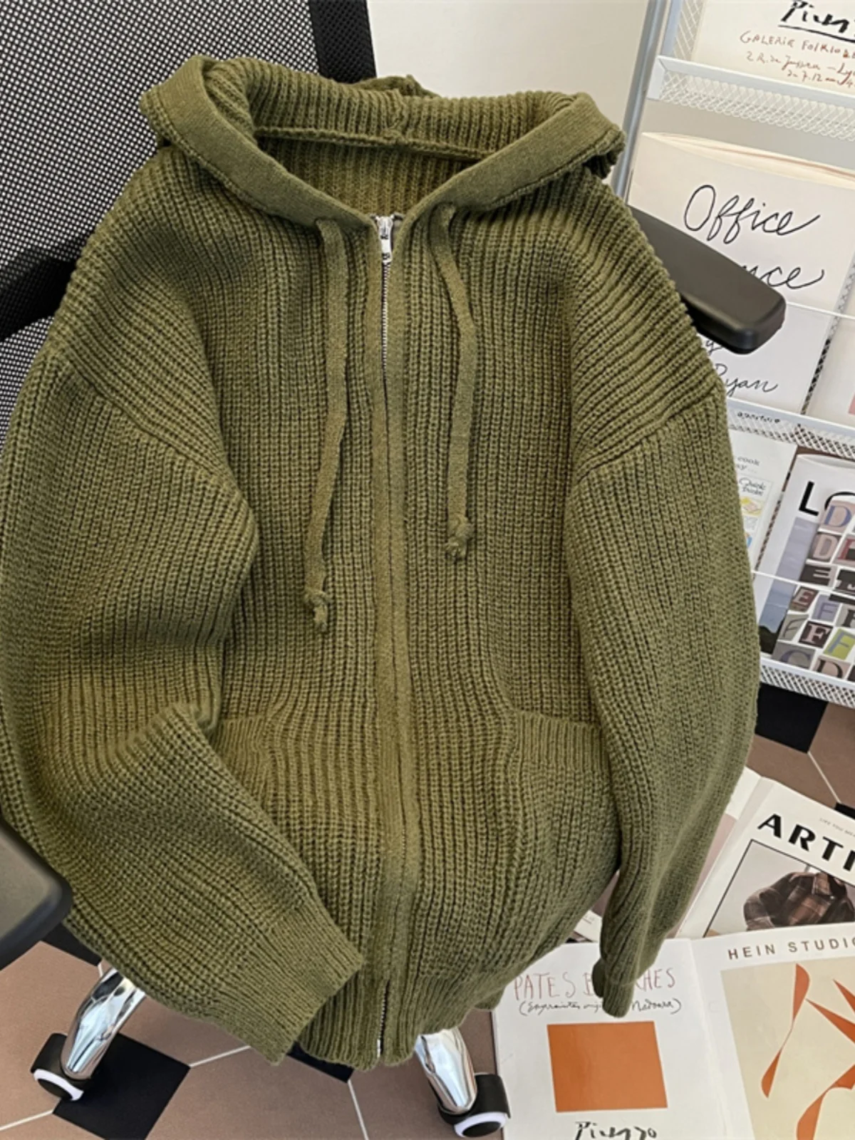 남성용 후드 니트 가디건 스웨터 루즈핏 아메리칸 스타일 레이지 커플 탑 신상품 가을 겨울 2024 패션