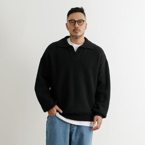 [러기드하우스]러기드하우스 오픈 카라 오버핏 램스울 니트 블랙