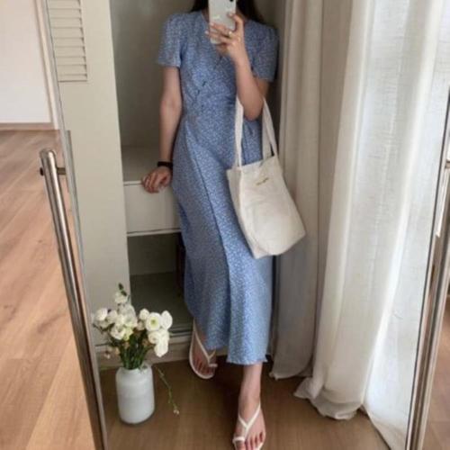 (스타일하우스) 원피스 OPS 로맨틱한 블루 드레스 랩스타일 꽃무늬 쉬폰 브이넥