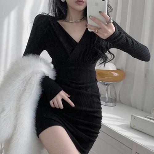 [셀럽하우스]골지 EQAE6347 니트 원피스 미니원피스 주름 플리츠 랩 하객