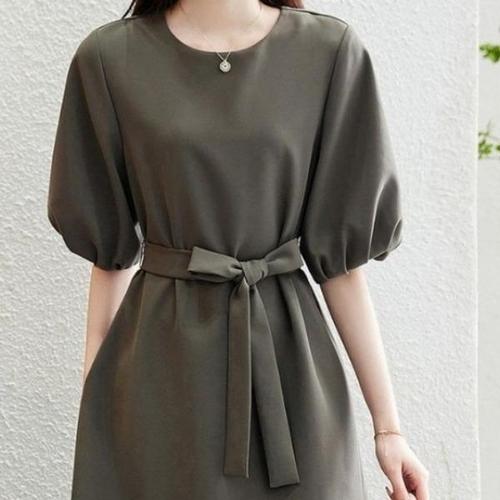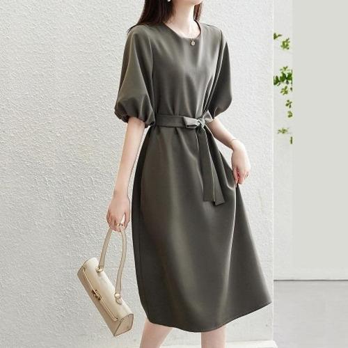 [보니제이]셔츠카라 랩스타일 벨트 퍼프소매 롱원피스 오피스룩