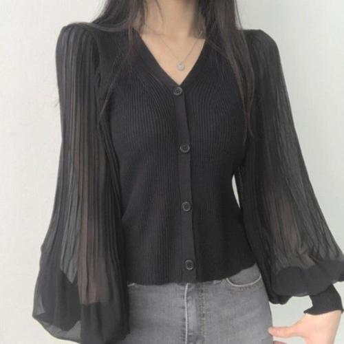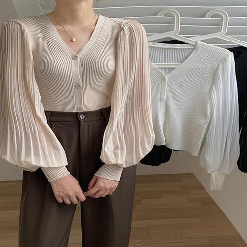 [옷자락]여성 러블리 브이넥 골지 소매주름 블라우스 가디건