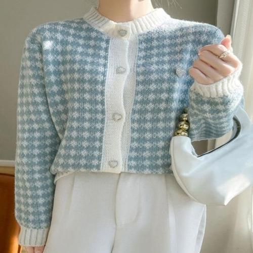 [엄지척]여자 4컬러 러블리 하트단추 브로치 체크 크롭 가디건_19791575_667501