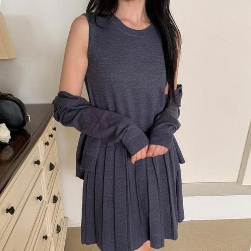 [신상오픈런]여성 민소매 플리츠 미니 원피스와 벨트 가디건 세트