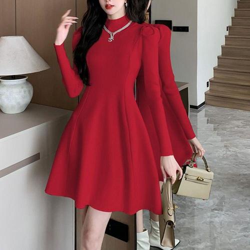 [셀럽하우스]연말룩 XRZS2115 여성 어깨 셔링 반폴라 미니 원피스 레드