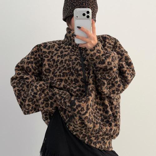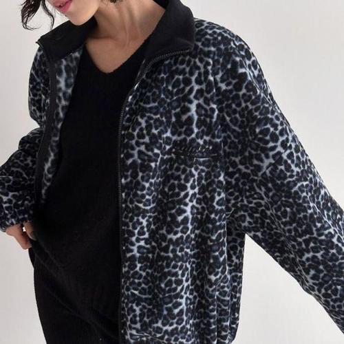 [삐까삐까]레오파드 양털 점퍼 덤블 하이넥 호피 후리스 집업점퍼 오버핏 따뜻한 겨울 캐주얼 아우터