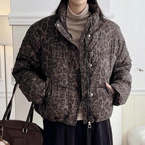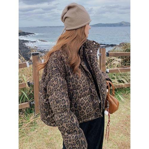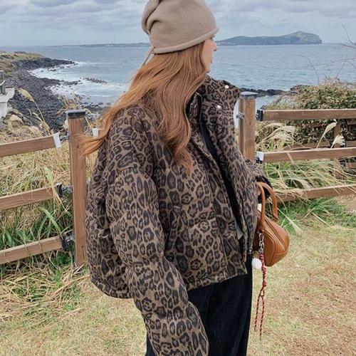 여성 호피무늬 쇼트 후드 패딩 점퍼 코트 루즈핏 도툼한 집업자켓 방한복 아우터 데일리룩