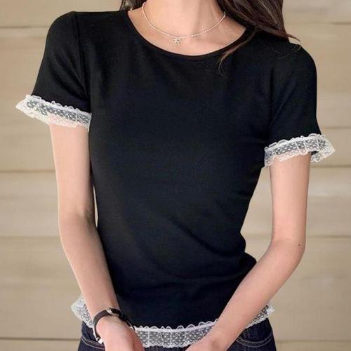 [신상오픈런]여성 라운드넥 반팔 티셔츠 레이스 레이어드 무지컬러