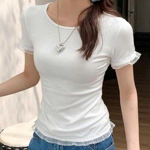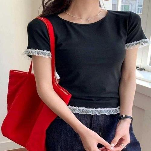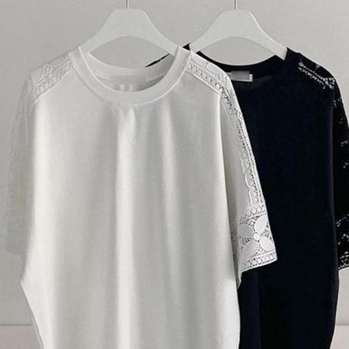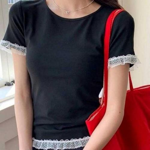 [셀러허브_여성트랜드패션]여성 슬림핏 여름티셔츠 2컬러 여성티셔츠 레이스 여름 반팔티셔츠 라운드넥