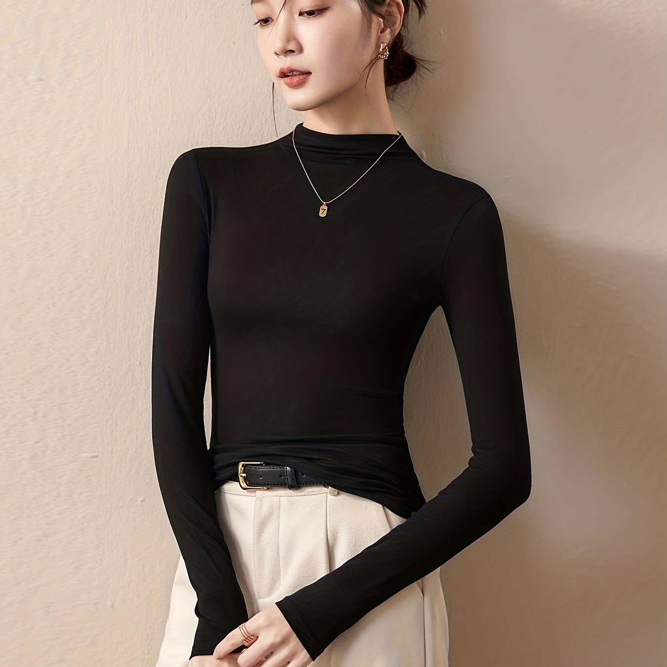 TEMU 모달 세미 하이넥 베이스 레이어 여성용 탑, 내부 또는 외부 착용 가능, 봄/가을 고급 블랙 슬림핏 셔츠, 캐주얼 커뮤터 탑