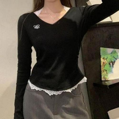 [셀러허브_여성트랜드패션]브이넥 페미닌 레이스 레이어드 여성탑 슬림핏 여러여리핏 롱슬리프 넥라인 포..