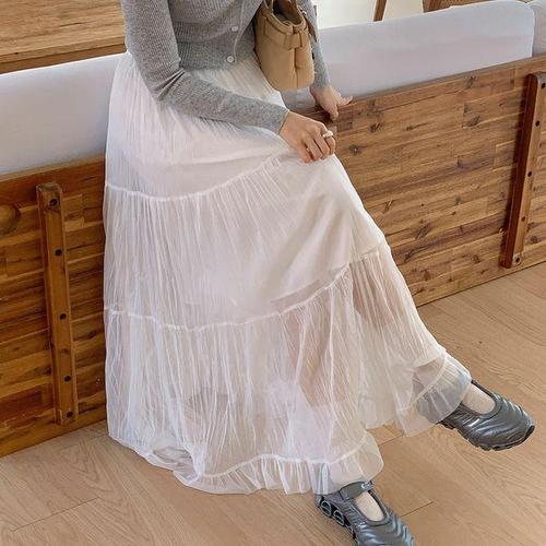 [옷자락] 여자 데이트룩 발레코어 쉬폰 주름 프릴 캉캉 롱스커트