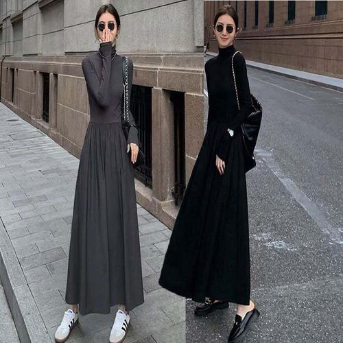 [셀럽하우스]여자 LLQQ4420 슬림 목폴라 긴팔 A라인 플리츠 롱스커트 원피스