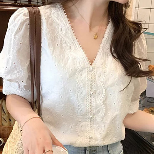 [오너클랜]인기상품 브이넥 레이스 화이트 하얀 블라우스 반팔셔츠 [WE62DD5_250918]