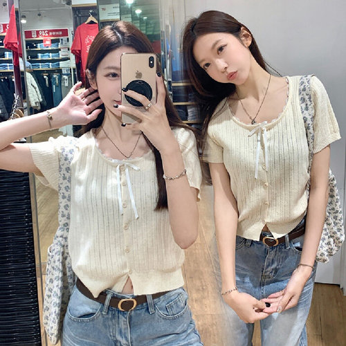 SAHINER 여성 반팔 니트 가디건 리본 레이스 버튼 데일리 봄여름