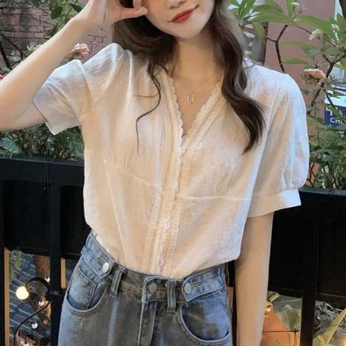 [오너클랜]인기상품 브이넥 레이스 화이트 블라우스 반팔 출근룩 20대코디 [WFB9D74_250918]