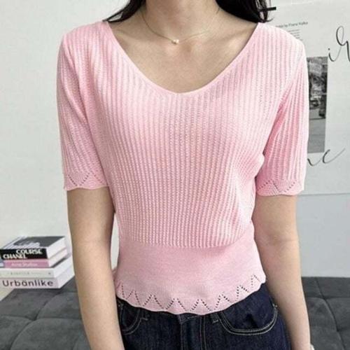 [셀럽하우스]여자 YIAW3729 심플 캐주얼 반팔 니트 필수템 여성 레이스 브이