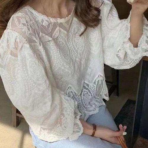 [에이치플러스몰]여자 퍼프소매 시스루 레이스 화이트 긴팔 블라우스