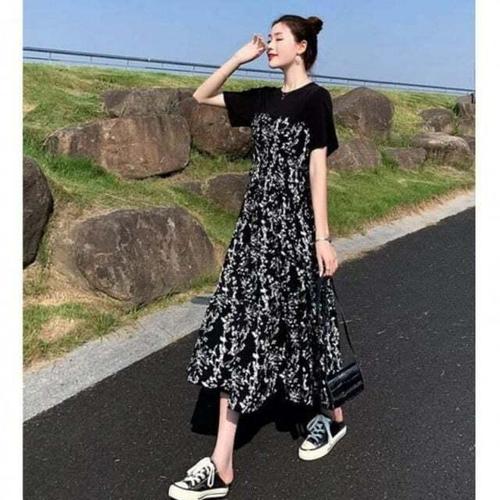 여자 여름 외출 간편 홈웨어 밑단 절개 캐주얼 롱 반팔 원피스 레이어드 봄원피스 프릴
