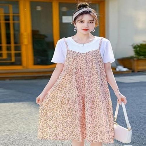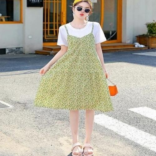 [신상오픈런]여성 캐주얼 레이어드 반팔 티셔츠 뷔스티에 긴 원피스