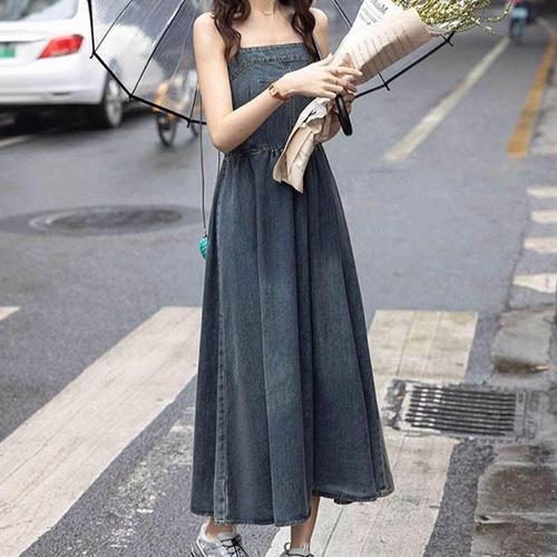 레이어드 원피스 데님 청 스모크 나시 여자 민소매 롱 WFLQ845